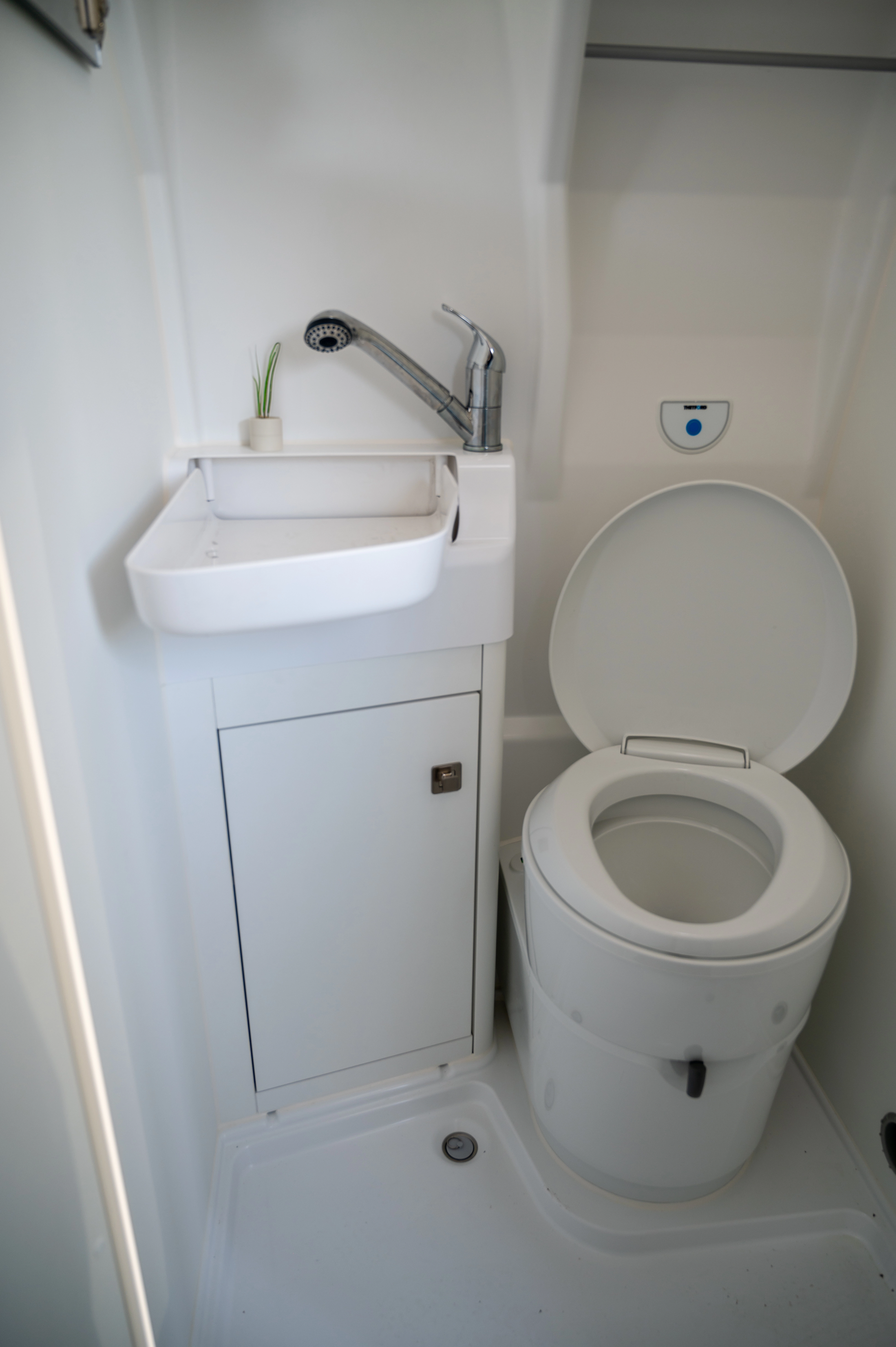 Cuisine toute équipée, frigo 80l, espace salon avec table et siège avant pivotants, pièce douche et toilettes, chauffage stationnaire pour l’hiver, le tout alimenté par des batteries auxiliaires et panneaux solaires !